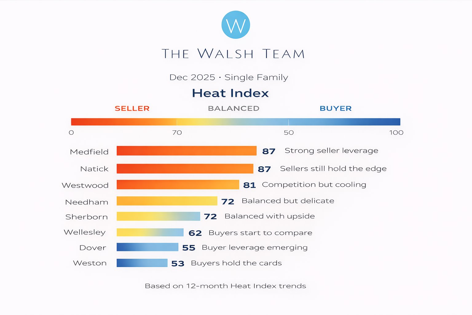 The Heat Index you’re seeing is a 12-month rolling view of buyer and seller behavior across MetroWest. It’s not designed for drama. It’s designed for patterns.