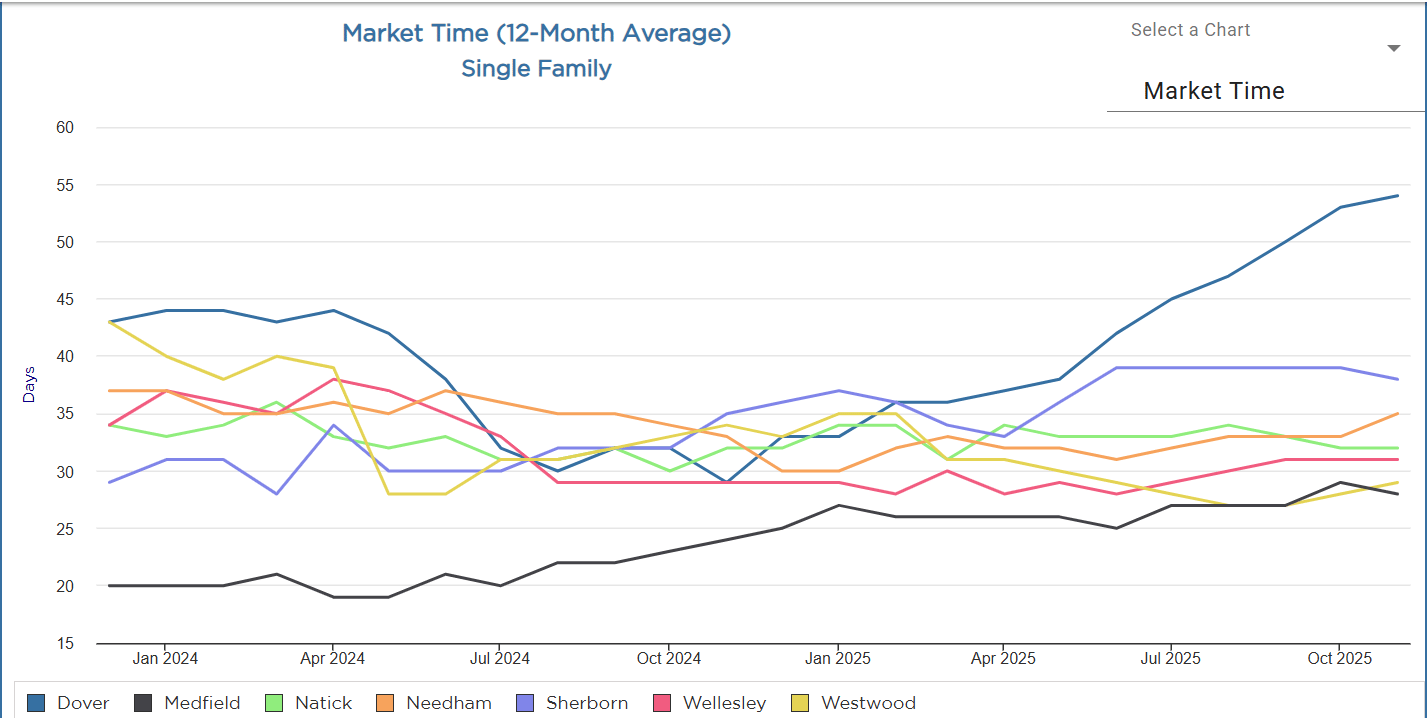 This is where Dover jumps off the page. If one town is broadcasting “buyers are taking their time,” it’s Dover. Meanwhile Medfield remains the tightest in this set — which matters if you’re pricing a home or writing an offer.