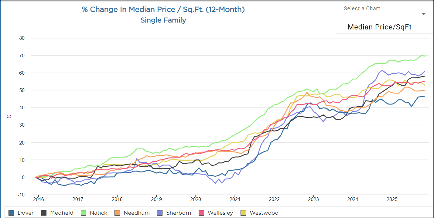 Price/SqFt growth: Ends near the top tier (mid/high fifties). Medfield’s long-run value story remains strong, and it holds up well on the far right of the chart.